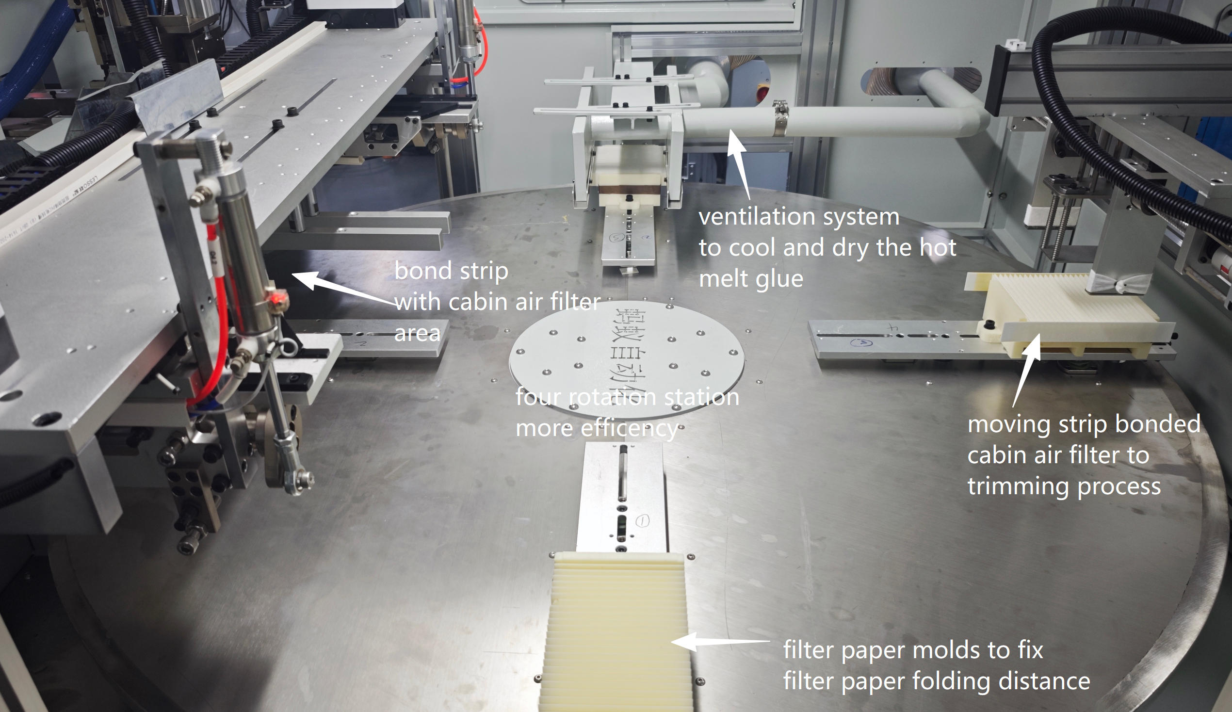 The mechanical hand will take over the strip bonded cabin air filter from convey belt to second short edge bonding process