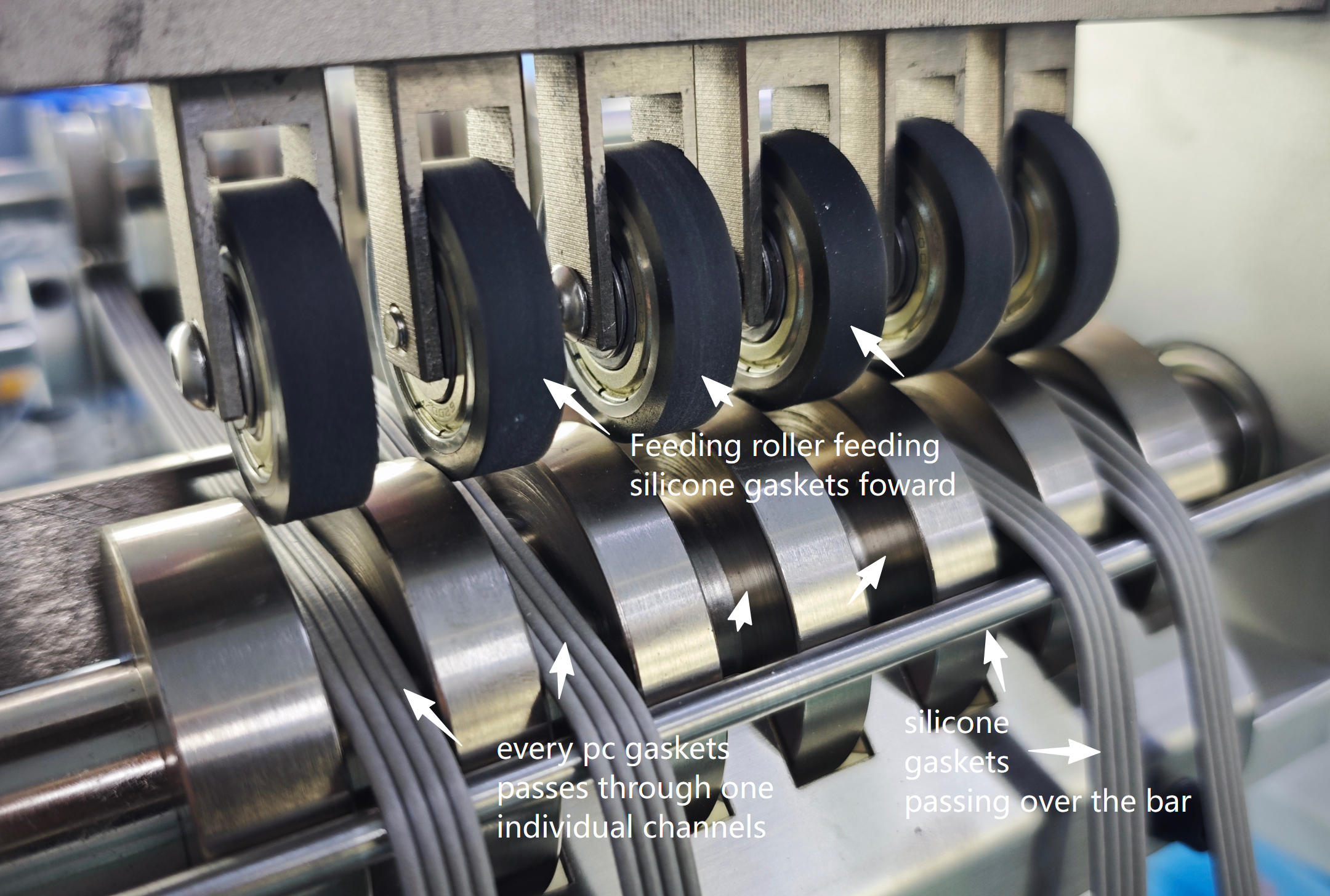 1, 5-6 pcs of silicone gaskets can be fed at the same time, Every pc silicone gaskets passes through one individual fixtures , they are fed in one alignment and do not cross each other ensuring smooth feeding process .