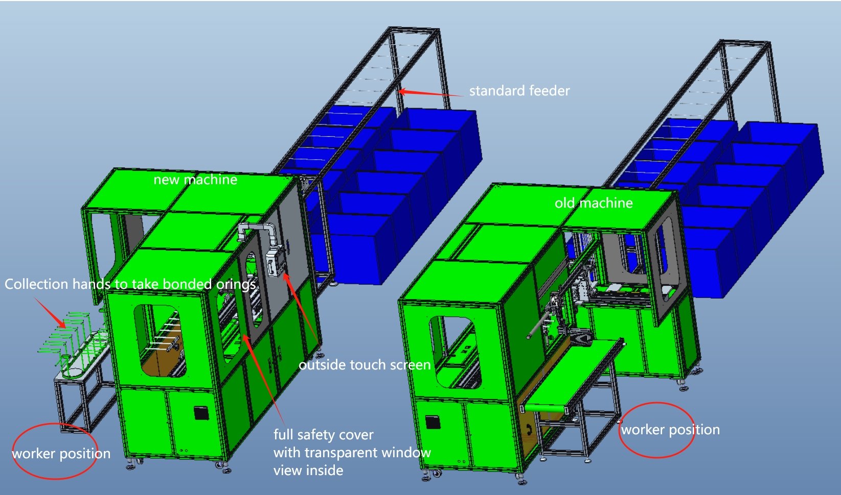 For safety reason , our customer also requires the touch screen to be extended out of the machine body and apply full safety cover doors , the machine was made in reverse design compared to the old the machine he had purchased .so the inspection staff can sit between two machines and check joint quality of silicone gaskets .it is easy for the inspection worker to care for both machines .